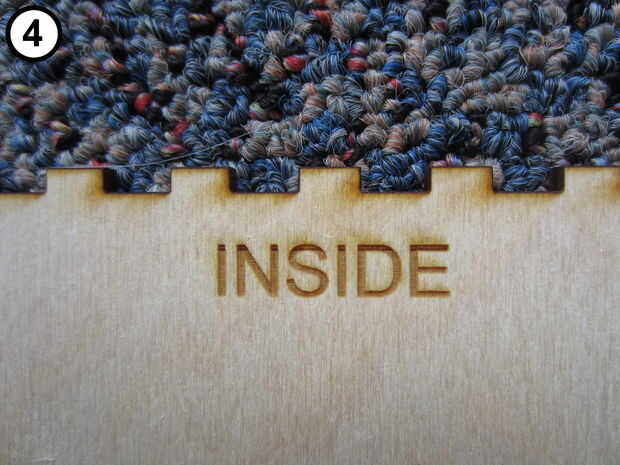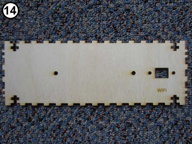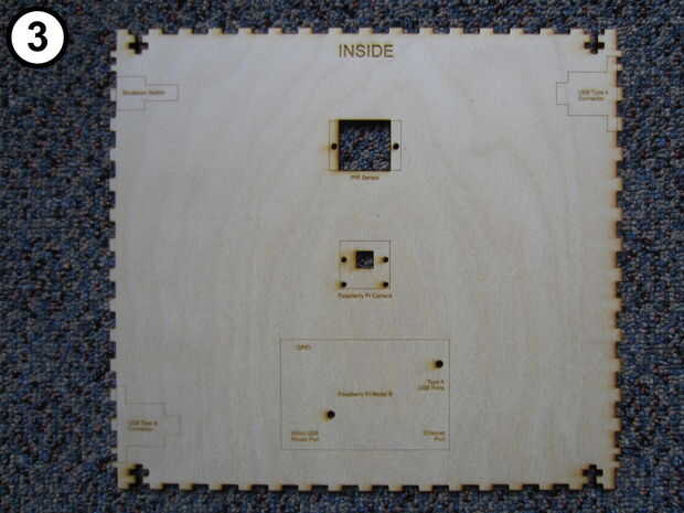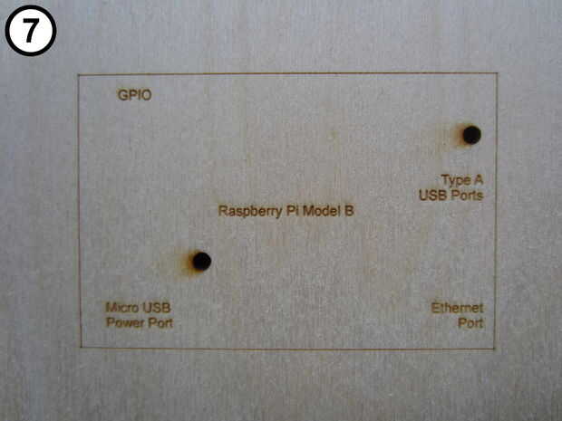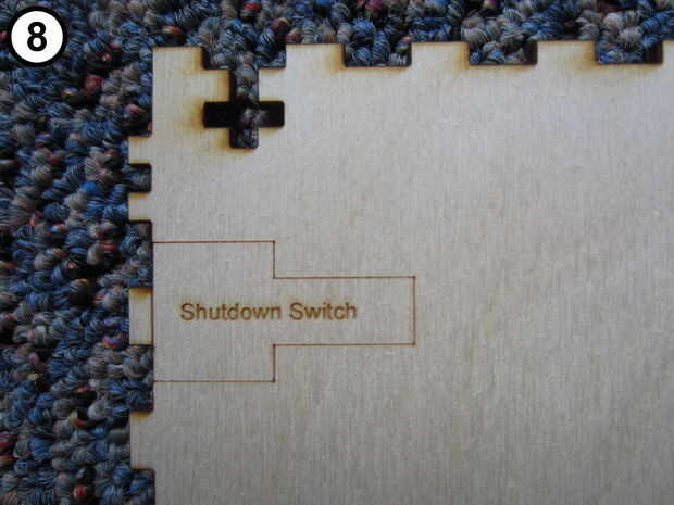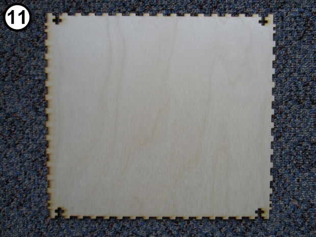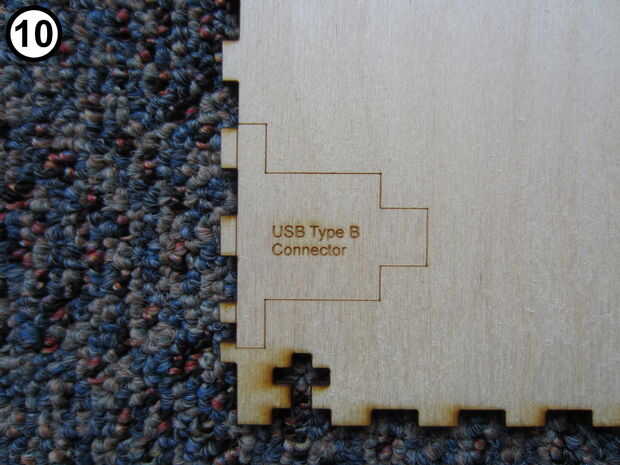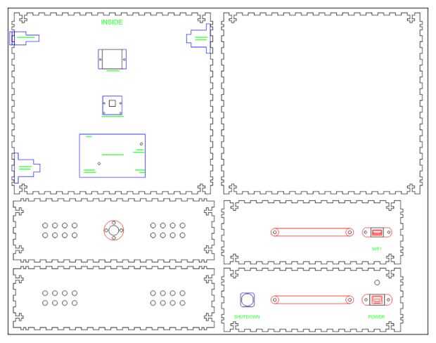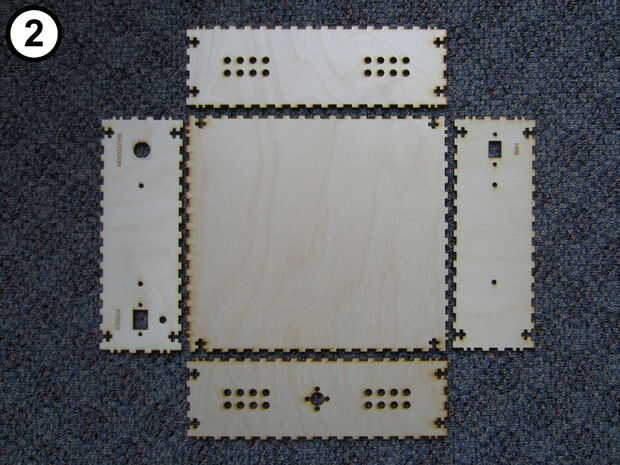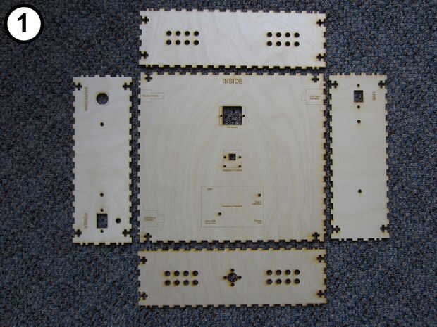 El primer paso es cortar las piezas para el caso de una hoja de contrachapado de abedul de 1/8"(3 mm). Un cortador del laser 45 vatios Epilog Helix en TechShop fue utilizado para cortar y grabar las partes. Todas las piezas del caso pueden excluirse de una hoja de 24 "x 18" de la madera contrachapada.