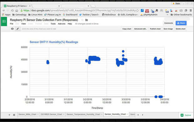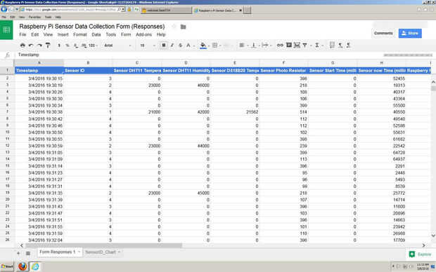 Iniciar algunos sensores y ver el tirón de frambuesa Pi los datos de las fuentes recogidas y entrar en sus campos respectivos de google. Ahora podemos ver los datos como se recoge del Google Docs y Google Drive.