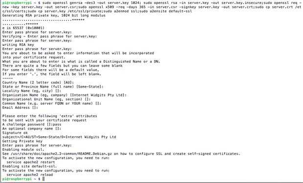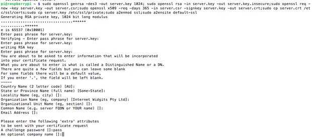 sudo openssl genrsa-des3-out server.key 1024; sudo openssl rsa-en server.key-cabo server.key.insecure;sudo openssl req-nuevo - clave server.key-cabo server.csr;sudo openssl x509 - req-días 365 - in server.csr - signkey server.key-hacia fuera server.crt;sudo cp server.crt /etc/ssl/certs; sudo cp server.key /etc/ssl/private; sudo a2enmod ssl sudo a2ensite default-ssl