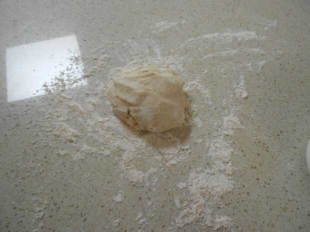 Añadir la harina, la sal y el agua y empezar a mezclar. Seguir mezclando y amasando hasta que la masa no es polvoriento o mojado, pero elástico y no tiene grumos. Si se vuelve muy quebradiza agregue más agua o añadir más flores si es demasiado húmedo.