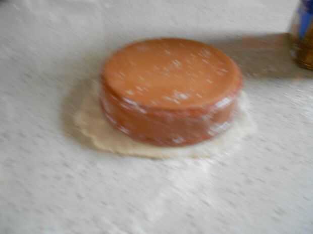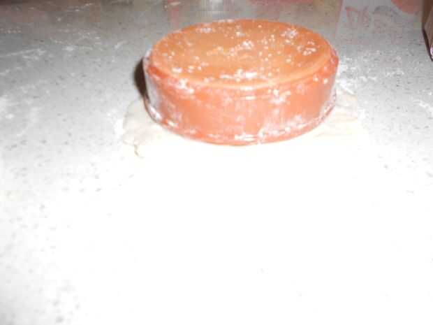 Dividir la masa en 1/2 y aplanar una sola pieza. Luego coloque el molde en la parte superior y cortar un círculo alrededor de una pulgada más grande que el molde.