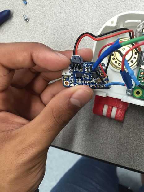 • El amplificador de PAM8302 conecta con el + y - lados del mini altavoz. Ruta energía conectándose VIN a 5V en el PowerBoost 1000C y luego Gnd a G.