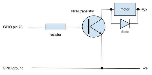 Una vez más, un interruptor es necesario aquí, así que el circuito anterior se repite para el motor. Sin embargo he añadido un diodo para proteger la Pi de la corriente generada por el motor cuando se corta la corriente pero el motor aún se vuelve un poco.