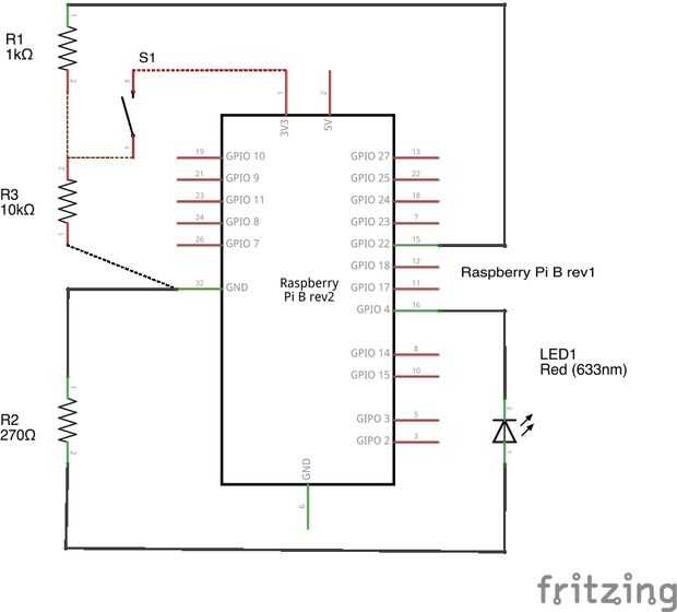El concepto es simple: el LED es una salida del pin 4 y el botón es la entrada del pin 22. El circuito de botón tiene una resistencia de pull-down. PIN 22 se va desplazando hacia abajo a cero a través del resistor de 10K cuando el botón está inactivo. Cuando es presionado, los 3.3V de la Raspberry Pi va en el pin 22 de entrada, pasando por alto la resistencia de 10 K.