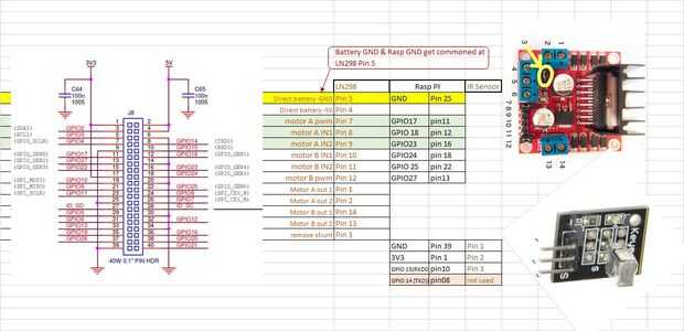 Consulte el esquema adjunto que preparé. Esto tiene todos los pin conexión detalles frambuesa PI, Sensor del IR, regulador del motor de LN298.