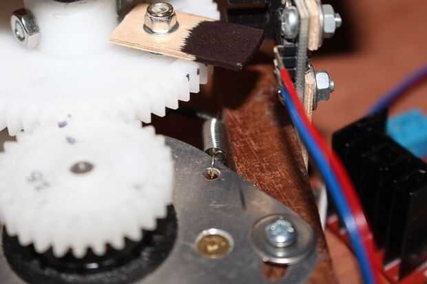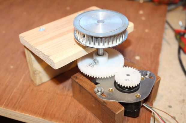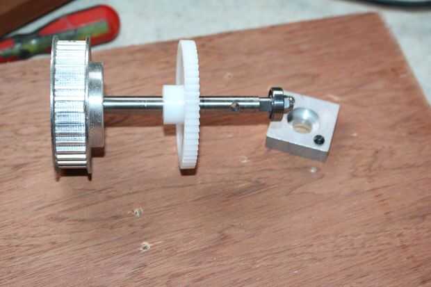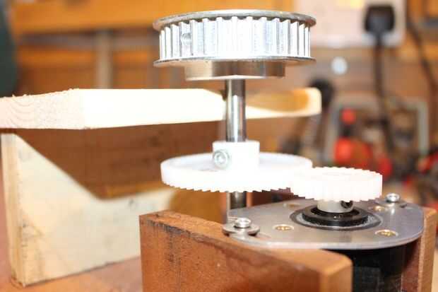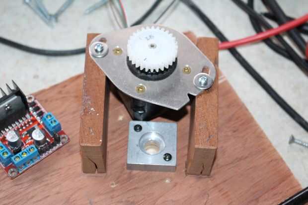Así que esto es realmente la primera parte de la construcción. He encontrado un poco de tamaño decente de 3/4 capas para utilizar como base y luego un par de trozos de caoba para utilizar como portadores de motor. Usted debe ser capaz de ver en las fotos que he montado en primer lugar el cojinete del eje de entonces con el eje en su lugar con el engranaje plástico grande (56 dientes MOD1) coloca entonces el motor paso a paso de los portadores de caoba. Cuando yo era feliz con el acoplamiento de los engranajes dibujaba alrededor de los portadores y había atornillada en su lugar. El motor entonces fue atornillado en su lugar, pero no... un tornillo fue colocado en el extremo de la ranura para que el motor no podía moverse de esa manera y el otro tornillo se colocó así que podía usar un poco de la primavera para poner un poco de tensión en los engranajes y eliminar la reacción. Esto funcionó muy bien... sin embargo el eje sólo tiene un rodamiento en la parte inferior dos pedacitos de pino fueron tornillo a la base y la pieza superior tiene un corte en el lado para permitir que la parte superior del eje en la arboleda y alinee el eje. Espero que todo tiene sentido y las imágenes deben ayudar a llene adentro cualquier boquete en mi Descripción!