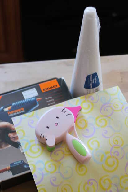 De la torre necesita un cono de espuma 3 7/8 x 11 7/8, un pedazo de papel de scrapbooking de 12 x 12, pegamento caliente, doble la cinta echada a un lado y una placa. La torre es opcional, sin embargo es un producto final mucho más agradable como cuando eliminas cada empanada, ves el papel decorativo, frente a la espuma de poliestireno desnudo.