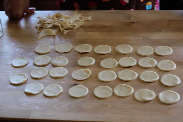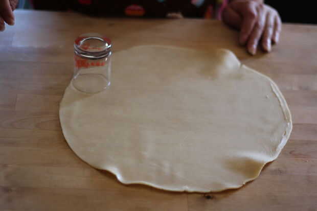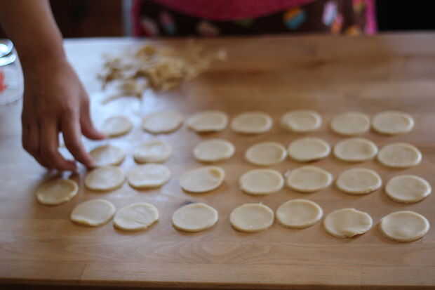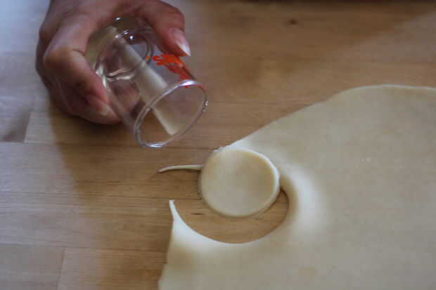 Una vez que han desplegado la base de tarta, utilice su vaso para cortar círculos de aproximadamente 30, cualquiera de la masa de desecho estirar y cortar círculos más. Esto se repetirá con la segunda corteza también, pero hice los pasteles en dos tandas debido a limitaciones de espacio. Asegúrese de guardar la chatarra masa como usted necesitará exprimir tantos pies hacia fuera como sea posible.