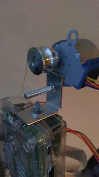 a continuación se que necesita conectar el motor paso a paso con el caso. Me perforó un agujero en mi caso de pi y empernada en la escuadra. A continuación atornillados en el motor al otro extremo de la escuadra. El motor ahora está en un extremo de la caja de pi con el eje paralelo con el borde superior como en la foto.