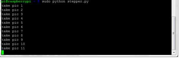 Ahora conecta el poder a usted pi y lo arranque. El cable adaptador USB y toma de corriente debe ser libre de conectar con el pi para toda. A continuación, conecte a su pi con putty y WinSCP. en el tipo de terminal (a través de la masilla) en sudo python stepper.py. el script debe empezar y tras una breve pausa de impresión "tomar pic1" a la línea de comandos. Entonces el motor debe patear y mover el pi a lo largo de la línea una distancia muy corta. Es casi imperceptible por lo que será más evidente si se está moviendo (o no) después de algunos ciclos. A través de la masilla debe mirar como el cuadro después de un tiempo.