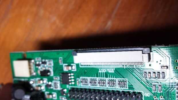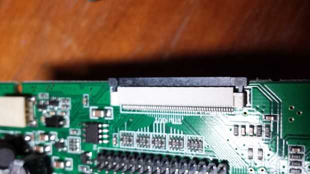 Luego, enchufe el cable de cinta desde la pantalla en el tablero de control con la misma orientación como en la imagen. Asegúrese de desbloquear las pestañas de negro primero y para después de insertar la cinta. (Pantalla y teclado deben tanto endecha plana hacia arriba.)