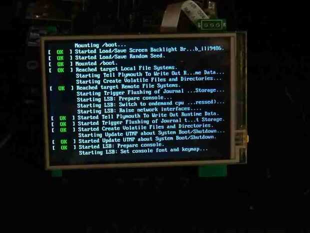 Ahora puede reiniciar y si tiene éxito, usted debería ver una el desplazamiento de la consola por en el arranque en el TFT. (ver foto) Para iniciar sesión en la consola TFT puede ir [CTRL + ALT + F1]. El siguiente paso es duplicar la pantalla HDMI para el TFT.
