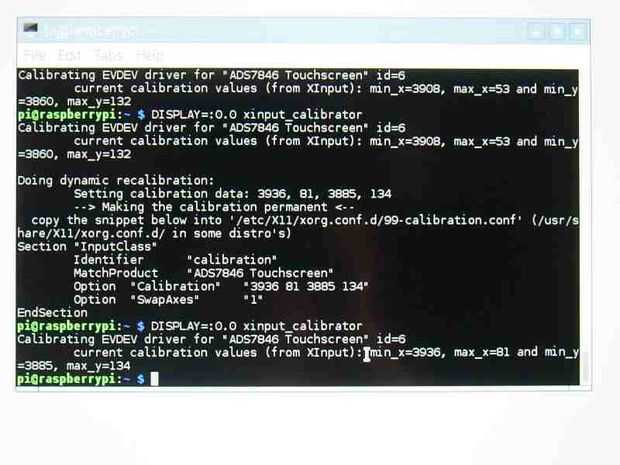 Siga las instrucciones haciendo clic cada uno de los 4 pelos de cruz roja con un lápiz en el TFT y tenga en cuenta los valores indicados en la terminal (ver foto). Ahora puede introducir los valores en la línea de la opción "Calibración" de /usr/share/X11/xorg.conf.d/99-calibration.conf. (Ver Video)