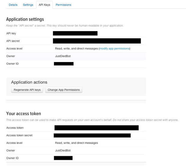 Copie las cadenas alfanuméricas para la API key, API, token de acceso y acceso token secreto en un lugar seguro como 1Password al menos a un archivo de texto o a Evernote.