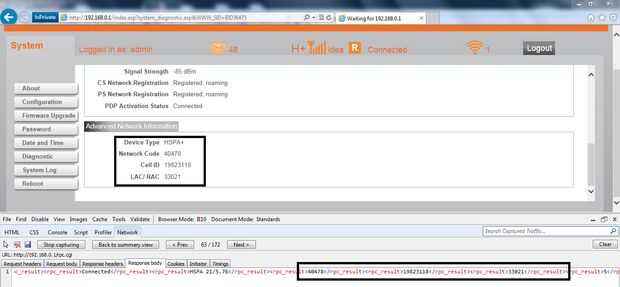 Como se muestra en la imagen, configuración de página http://192.168.0.1 muestra código de acceso de ubicación y de la célula torre ID. Presionar F12 en el navegador muestra llamadas de red y datos enviados/recibidos del cliente (el navegador) y el servidor (dongle). Comunicación entre cliente y servidor puede ser emulada usando Python. Código para obtener y analizar esta información está en Simlocator.py. Sólo jugar con el código y ver va para usted.