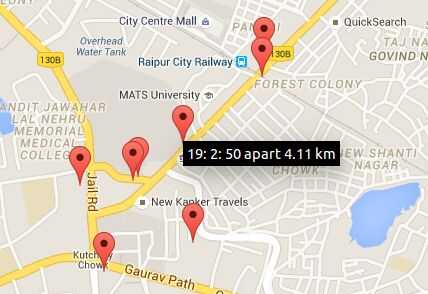 Como se muestra en la captura de pantalla, pasados pocos lugares traídos de Sparkfun y se muestran como marcadores de Google. Puede también seguir la distancia de un punto de partida decir su hogar, Colegio o lugar de trabajo. Es necesario dar la latitud y longitud del punto de partida en map.html. Al ratón asoma sobre un marcador, que muestra la hora local cuando se registró la posición y la distancia desde el punto de partida.