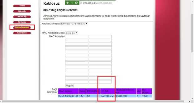 En el módem, ir a la ficha inalámbrica >> conexión inalámbrica a Internet >> puedes ver la placa Raspberry Pi está conectando al módem USB Wi-Fi antena dongle. El módem muestra cuál es la dirección IP del Raspberry Pi.