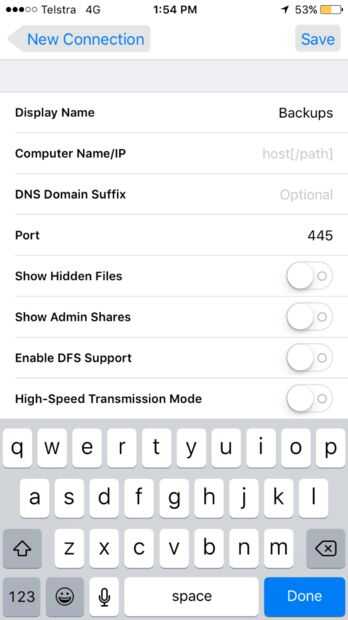 Al abrir la aplicación se efectúa con una pantalla que tiene locales, Fototeca y favoritos. Haga clic en el botón + parte superior derecha y seleccione recurso compartido de red. Rellene el nombre para mostrar como lo que quieres (he hecho copias de seguridad de mina) IP de la Pi (puede comprobar lo que tu IP es tecleando ifconfig en el terminal en el PI. Desplácese hacia abajo para wlan0 y debe estar al lado de inet addr:) Poner la dirección IP ahí salvar a prensa.