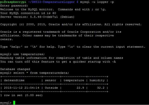 Ahora prueba que las lecturas se escriben en la base de datos correctamente en DHT22-TemperatureLogger carpeta, tipo siguiente y pulse Intro.