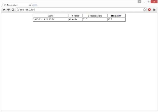 Entonces una vez más, en el tipo de navegador de PC en la IP dirección de la raspberrypi y debería ver la página, pero esta vez con información de la temperatura de su base de datos MySql (imagen adjunta como referencia).