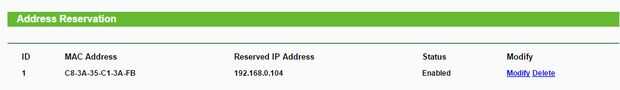 Tomar nota de hwaddr (esta es la Mac y el inet addr , que es la IP) luego crear reserva de dirección su DHCP / reseravtion la lista de direcciones. Consulte la guía de usuario de routers para ver cómo esto se puede hacer en su propio router. Tengo TPLink dirección reserva se ve exactamente como en la imagen adjunta.
