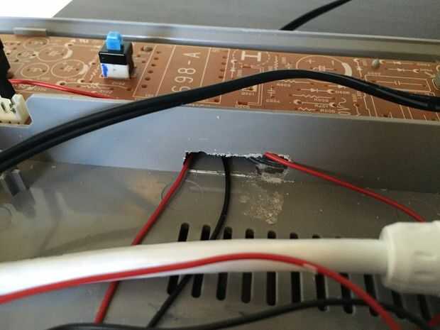 En lugar de tender cables en lugares donde pueden quedar apretados cuando el caso volver a poner juntos, corté un pequeño agujero en la pared divisoria de plástico usando un taladro y un pequeño archivo para ejecutar mis cables a través. Puede parecer un poco desordenado, pero una vez que la consola ha sido recompuesta, nadie se dará cuenta.