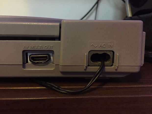 Taladré un agujero en el power point original en que pude correr mi fuente de alimentación micro-USB en la consola. Esto es un poco de ensayo y error, usando un taladro y un pequeño archivo hasta que el agujero es lo suficientemente grande como para permitir que el cable pase a través. También se puede ver en caliente-pegué mi cable HDMI para el caso en lugar del viejo puerto AV Multi Out.