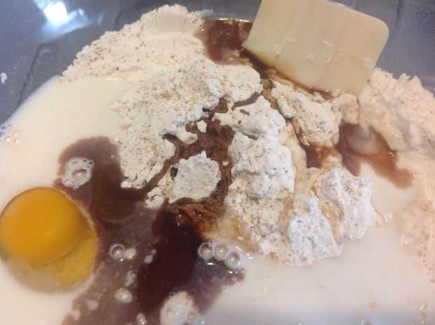 1 y 1/4 taza de harina en un bol grande se mezclan Añadir al mismo tazón 3/4 taza de azúcar y 2 cucharadas de polvo de hornear Medida 1 taza de leche y 2 cucharaditas de vainilla Extracto Añadir un huevo y mezcla de pastel se combinan con mezclador
