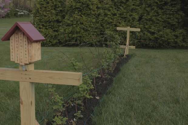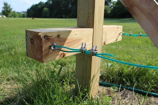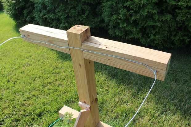 Alambre revestido plástico funcionamiento entre ganchos. Usé un cable dedal y abrazadera para fijar los cables. Tenga en cuenta que este paso puede realizarse en una fecha posterior ya que las plantas será pequeña por un tiempo. Prolongando este paso permitirá que tu post resolver completamente en el suelo - menos ocasión de inclinarse.