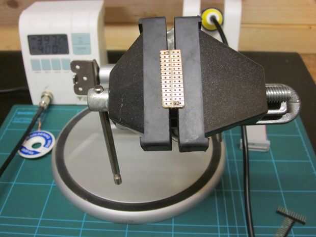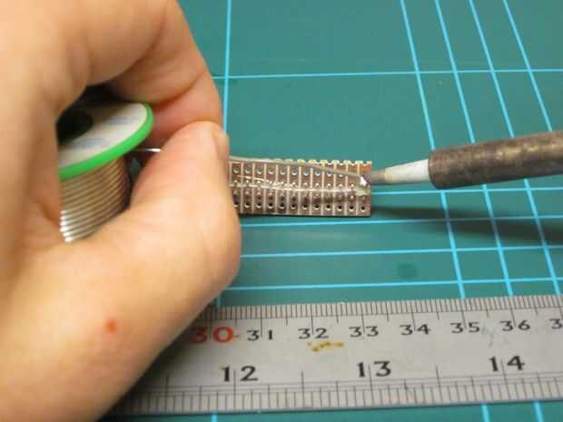 Como debe ser obvio, sólo tenemos que conectar los pares de pines, para completar el circuito. Quitar los encabezados de fila y soldadura sólo el encabezado de dos fila primero. Será más fácil si usted un par de pines de esquina opuesta para mantener en su lugar, a continuación, acabar con el resto de la soldadura. Si agregar demasiada soldadura y haz un puente, usar alguna mecha de soldadura a chupar el exceso y empezar de nuevo. También puede ayudar a añadir un poco de flujo extra de una pluma de flujo si usas sin plomo de la soldadura y no fluye muy bien.