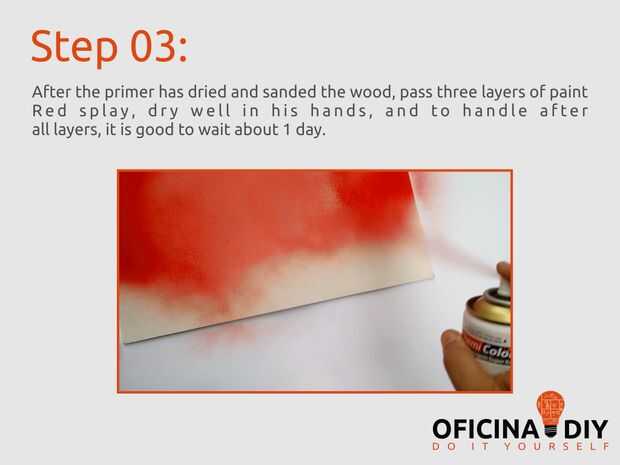 Después de la cartilla tiene seca y lijada la madera, pasar tres capas de pintura roja splay, pozo seco en sus manos y capas manejar después de todo, es bueno esperar aproximadamente 1 día.