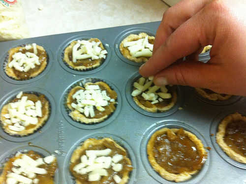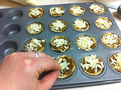 Espolvorear el queso sobre las empanadas de cebolla. Asegúrese de limpiar cualquier cebolla o queso que cae en la bandeja. Es una pena para fregar apagado después de se ha cocido al horno en.
