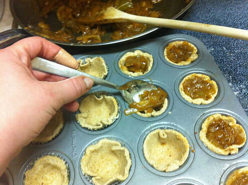 Utilice una cuchara para sacar con pala la mezcla de cebolla en las cortezas. Pulse la cebolla suavemente para eliminar bolsas de aire. Estos funcionan mejor si la mezcla de la cebolla se mantiene densa.
