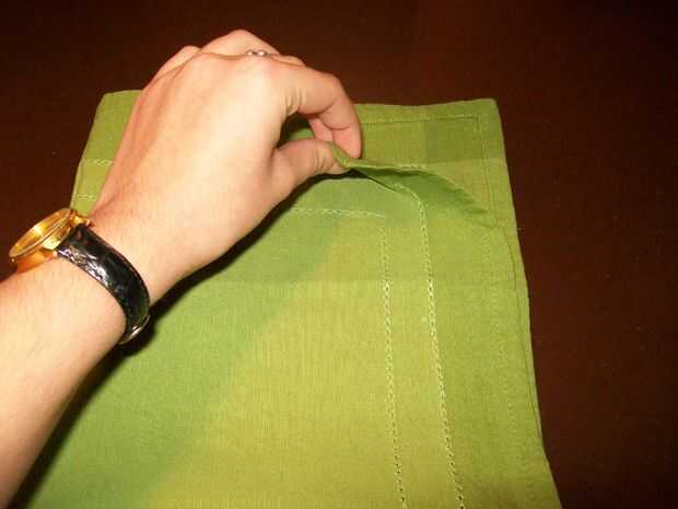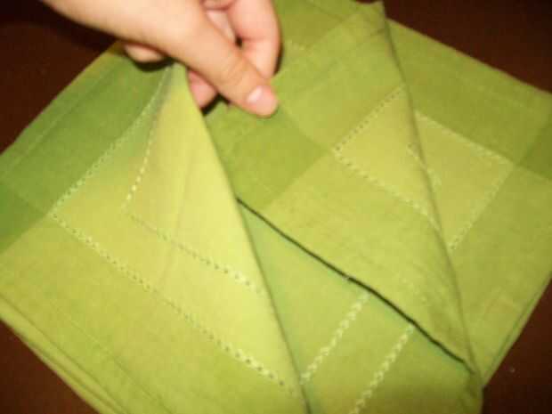 Piel vuelta de la primera capa de la servilleta de la esquina superior derecha hasta la esquina inferior izquierda y suavemente tire aplanarla, tomar la segunda capa desde la esquina superior derecha meta parte del borde por debajo del primer pliegue diagonal y hacer lo mismo para la tercera capa (el borde va debajo de la segunda capa).