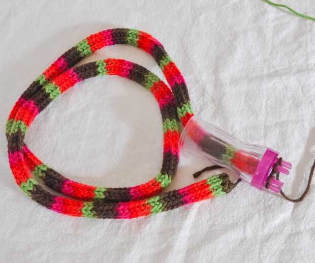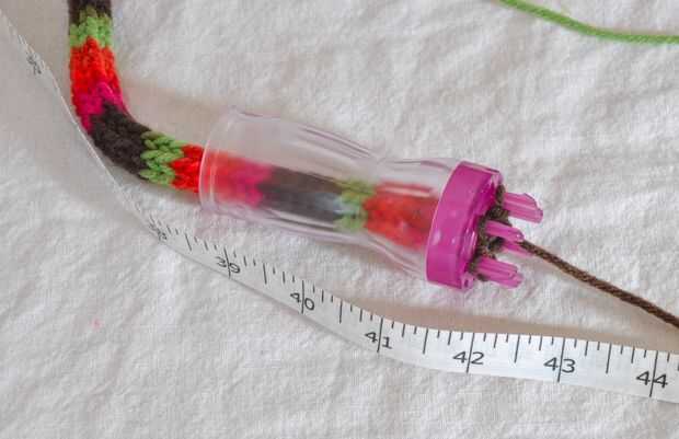 Cuando se mide dos veces alrededor de mi cabeza con una cinta métrica, surgió alrededor de 46". Y terminé de tejer un cordón que estaba cerca de 42". Por lo tanto, puede utilice como guía, o ir para él.