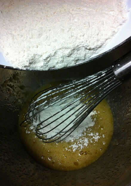 Batir la harina, polvo de hornear y la sal. En un recipiente separado, medianas,