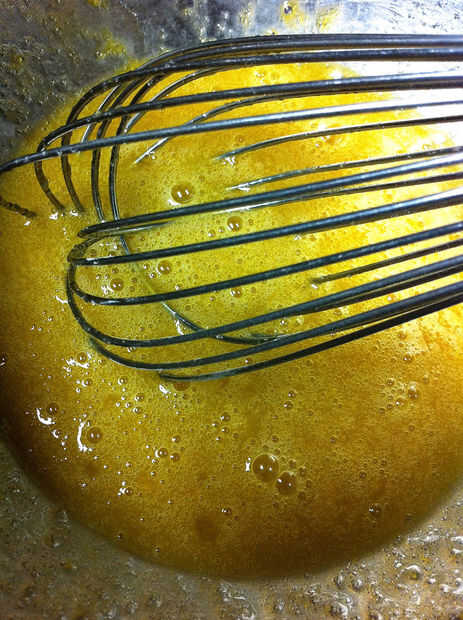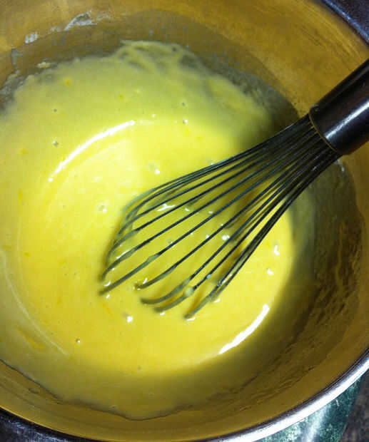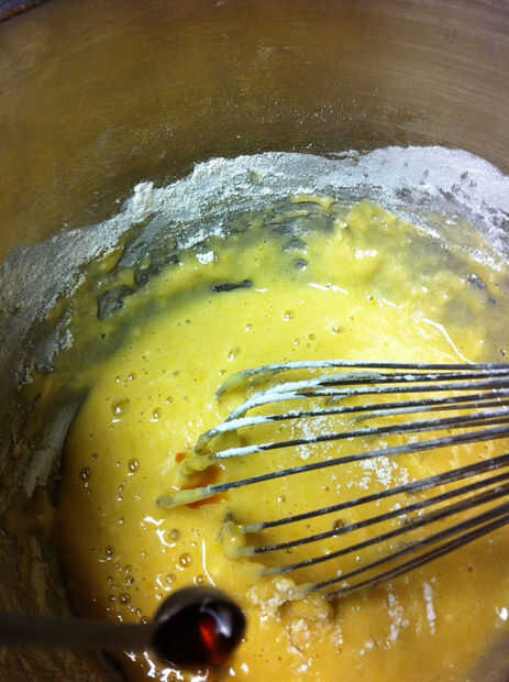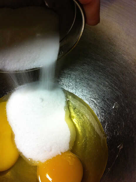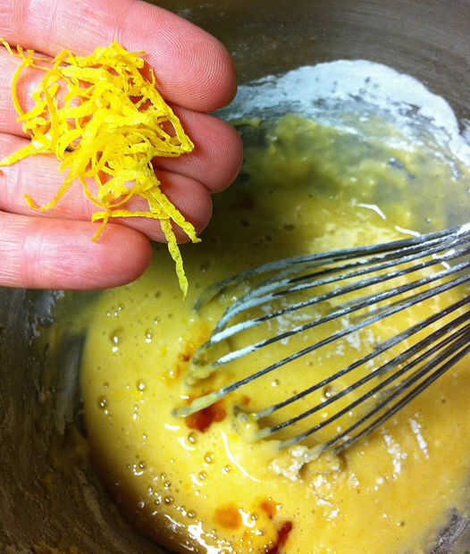 el huevo y mezcla de azúcar, luego agregar la ralladura de limón y vainilla. Bata suavemente en el fundido