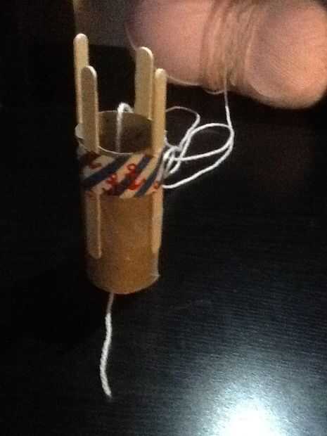 Enrosque el extremo de la cola del hilo hacia abajo a través del tubo, con palitos orientados encima de. Baje unas cuantas pulgadas de la caída del hilado más allá de la parte inferior del tubo.