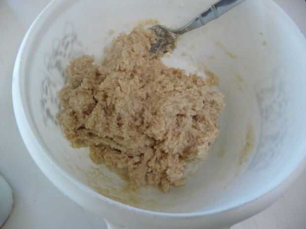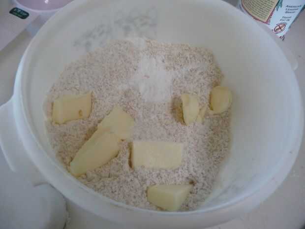 Utilizando un tenedor (o dedos), cortar la mantequilla en la mezcla de harina hasta que no queden grumos. La textura debería parecerse a las migas de pan.