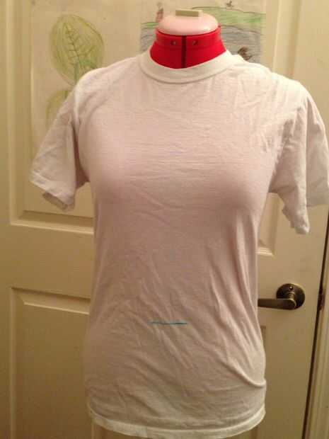 En la foto, tengo aprox. quince pulgadas de cuello a final de franja como se indica por la línea azul. Este paso se puede hacer mientras que llevas la camiseta.