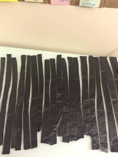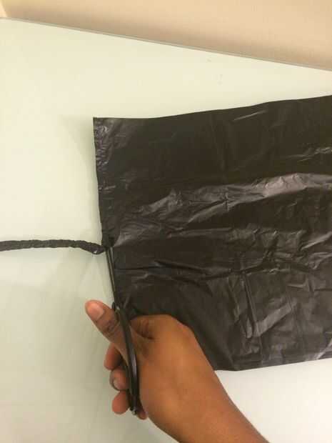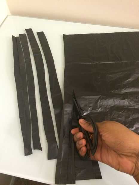 3. Corte las maneras largas de la bolsa en tiras de aproximadamente 1 pulgada. No te preocupes demasiado rectas. No ves cuando termine.