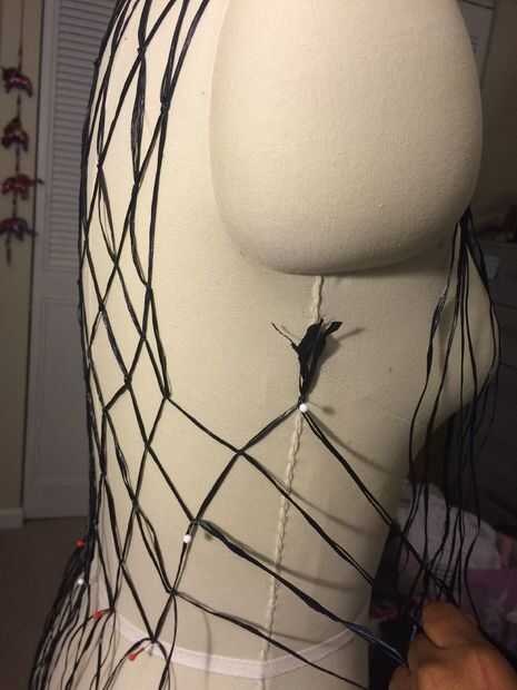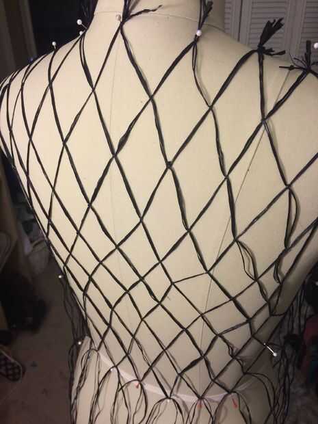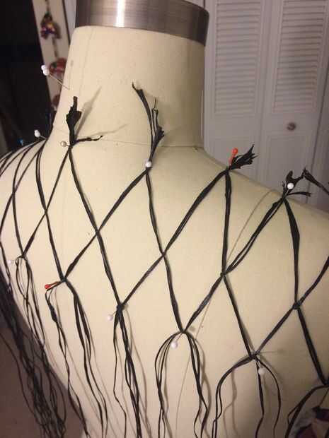 4. al llegar a la parte inferior de la sisa, añadir cuatro hilos anudados para conectar la parte de atrás al frente.