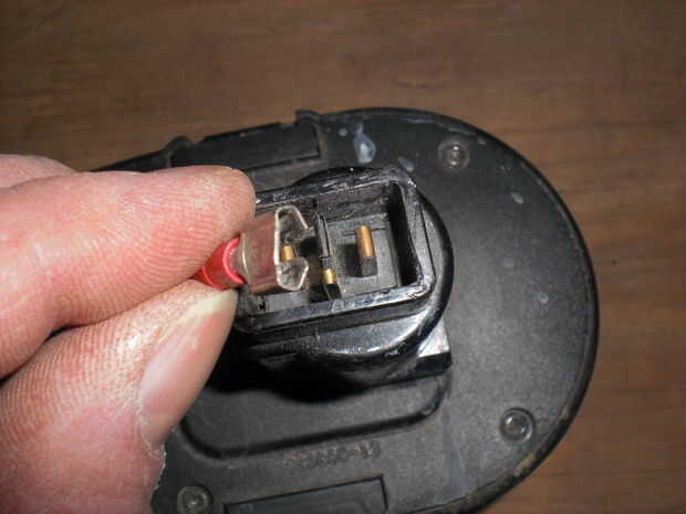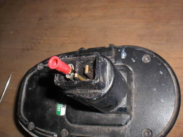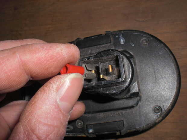 Los otros 2 terminales se abrieron con un destornillador pequeño de hoja plana. Debe abrirse lo suficiente para un calce en el terminal de batería de DeWalt. Si se abre encima de demasiado, alicate su ajuste al tamaño correcto.