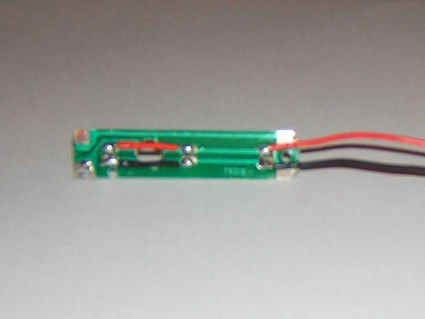 Una vez que el chip se ha ido y las conexiones están rotas, la soldadura de cables entre cualquier LED conectado ya no por trazos en la pizarra (véase abajo). Además, la soldadura 4" cables de la corriente de la Junta. No olvide conectar el rojo al positivo y negro negativo (otra vez ver más abajo).