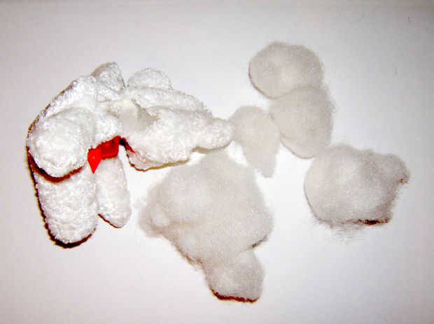Una vez abierta la parte posterior del cuello puede retirar todo el relleno de la cabeza y el estómago del oso. Para ayudar a volver a rellenar más adelante, dejar el relleno en los brazos y pies.