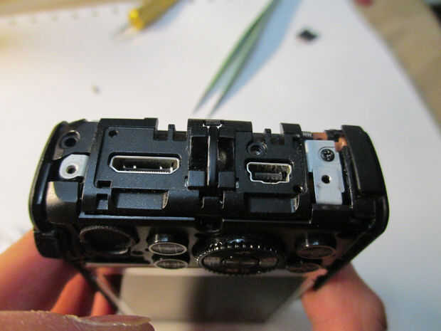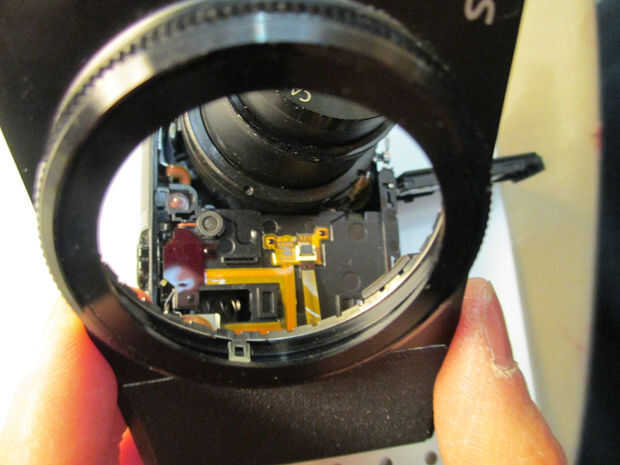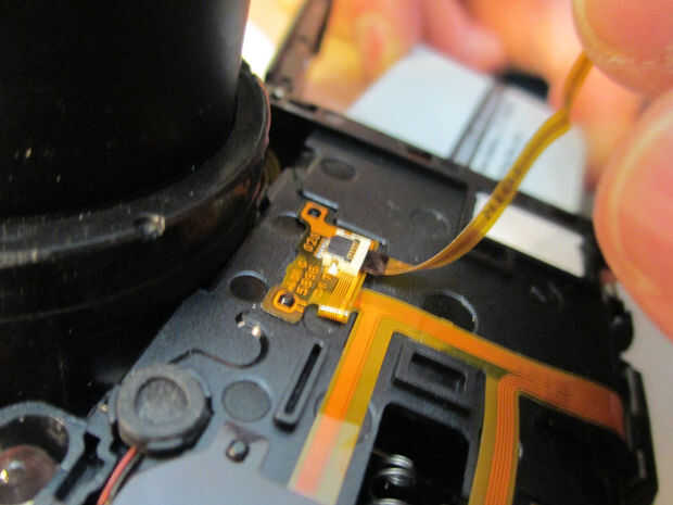 La cubierta frontal de la cámara en mi caso fue unida a la electrónica interna por un cable de cinta. Tener mucho cuidado, como los cables de cinta son muy frágiles y fácilmente se pueden ajustar. Desconectar el cable, levante el pestillo sostiene hacia abajo y saque el cable. Es muy práctico utilizar pinzas. Video de más abajo ilustra este proceso.