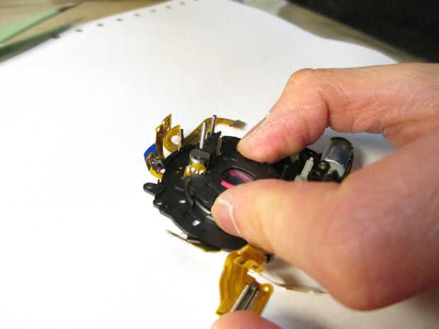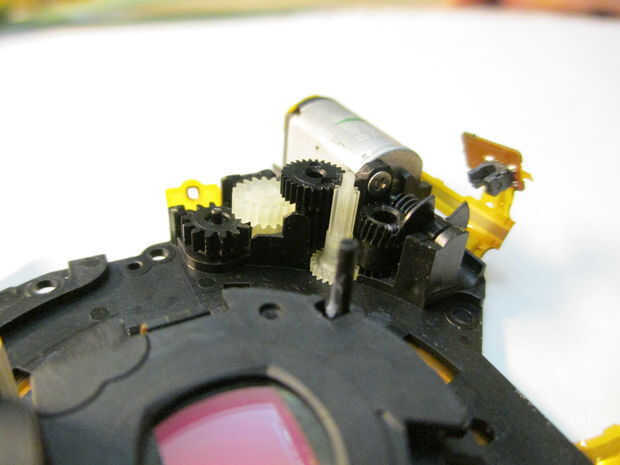 El sensor, como se puede ver, es sólo una delgada placa conectada a la Asamblea de lente (Figura 1). Usted tendrá que desconectar todos los cables de cinta de sus zócalos. Por desgracia, no tengo video de este proceso, tan importante: tomar fotos y vídeos de cable localizaciones y configuraciones antes de quitar los cables. Además, hay varios tornillos que sujetan el sensor a la lente. Una vez más, tomar fotos y vídeos para que sepas donde se encuentran los tornillos. Una vez haya quitado todos los tornillos y separados los cables de cinta, levante el ensamblaje del lente de la unidad del sensor, manteniendo firmemente la unidad del sensor sobre una superficie plana. La unidad del sensor tiene varias velocidades que se utilizan en extensión/rotación de la lente: Si eliminas el ensamblaje del lente sujetando en el aire, casi seguro bajará los engranajes. (Ver imagen 2) Ver video de referencia en la eliminación de la lente del sensor.