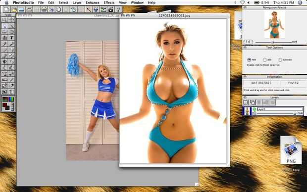 Primero seleccione su imagen base, aquí tenemos una rubia animadora, al decidir sobre las alteraciones físicas que desee. Abra una segunda imagen y usando la herramienta lasso seleccionar y cortar la zona deseada. Luego pegar la selección en la imagen base. Esto hará que una nueva capa.