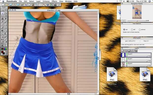 Si tienes hacer problemas para encajar una pieza Seleccione un área de la imagen base y pegar encima como una capa nueva. En este caso la falda y la pierna derecha deben ser alterado. Ahora usando la herramienta Borrador eliminar los solapamientos indeseados. En este punto tienes que guardar el archivo. Ahora fusionar las capas en una sola imagen con la herramienta dedo y la herramienta de clon (el icono de 2 ovejas) para combinar todas las piezas hasta que parezcan contiguas.