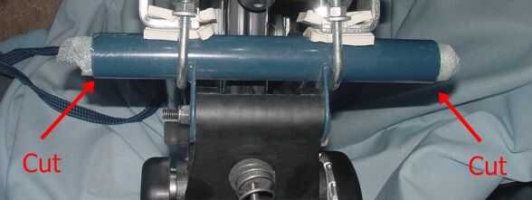 2. Corte el tubo con el soporte de montaje instalados, dentro de los montantes. Esto le da más espacio para el ajuste de lado a lado. Hacer los cortes como cuadrados y desprender las rebabas con una Lima.